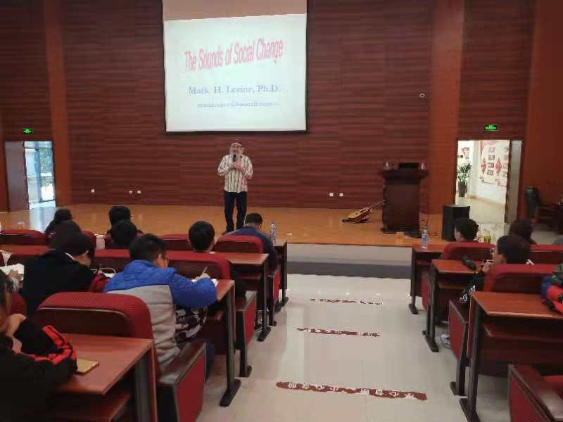 应云南省外专局、云南大学国际交流处和外国语学院的邀请,现执教于中央民族大学的美国专家马克·力文博士(Dr. Mark Levine)于2018年11月30日(周五)上午10:00-12:00在云南大学呈贡校区外国语学院一楼报告厅举行学术讲座。讲座的题目为U.S. History/Culture: The Sounds of Social Change(美国历史/文化:社会变革之声),讲述音乐在美国历史上的政治、社会运动中的作用,涉及废奴运动;大萧条时期美国工人运动;民权运动与反越战运动等。马克·力文博士在讲座中穿插着吉他弹奏,歌曲演唱,将音乐与政治、社会运动的紧密联系呈现给听众。演讲之余,马克·力文博士与学生听众进行互动。报告厅座无虚席,整个场面气氛较好,收到良好效果。