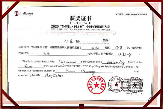 11月14日,2020年“外研社·国才杯”全国英语演讲大赛省级复赛(云南赛区)在昆明圆满举办,乐动网页版_乐动(中国)英语系本科生江乐旃同学作为云南大学的代表参加该项赛事,在指导教师张新峰博士的细心指导下表现突出,脱颖而出,以优异成绩获得特等奖,并将代表云南省参加12月份在北京举行的全国总决赛。