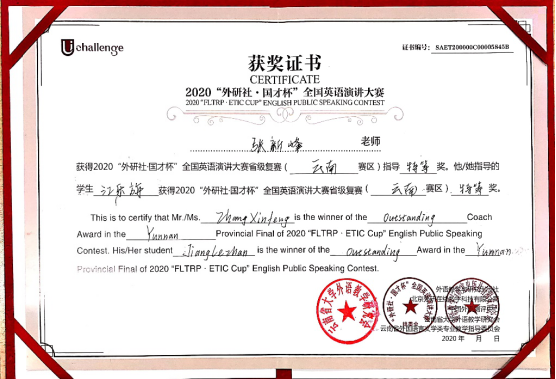 英语系张新峰博士在比赛之前及比赛期间悉心指导,协助江乐旃同学充分发挥了自己的实力与潜力,努力拼搏,因此而荣获“外研社·国才杯”全国英语演讲大赛省级复赛(云南赛区)指导特等奖。