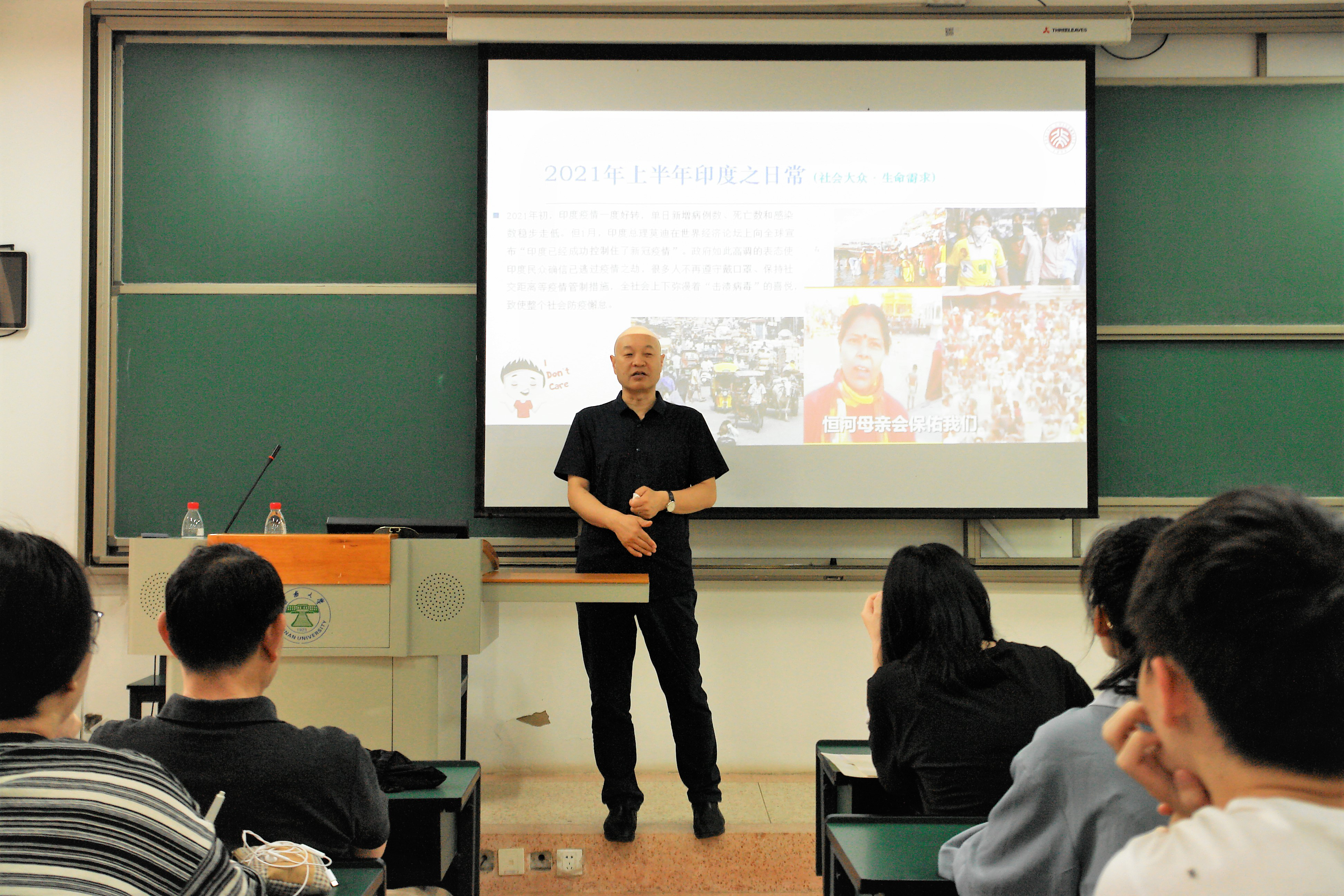 姜教授从印度政府宣布“战疫成功”开始,深入分析了印度疫情恶化以及各种“乱象”背后的政治、宗教和文化等原因。揭示了印度精英阶层对身份地位的追求、普罗大众对宗教信仰的需要,以及社会基本保障水平低下等原因造成的疫情下的印度“众生相”。姜教授还进一步探讨了中国的印度观和印度的中国观,指出中印两国在宗教信仰和传统文化方面的差异及其影响。最后的互动环节气氛活跃,师生们就中印关系、中国人的印度观与印度人的中国观、如何加强对印宣传等问题踊跃提问,姜教授一一热情而细致地做了回答。