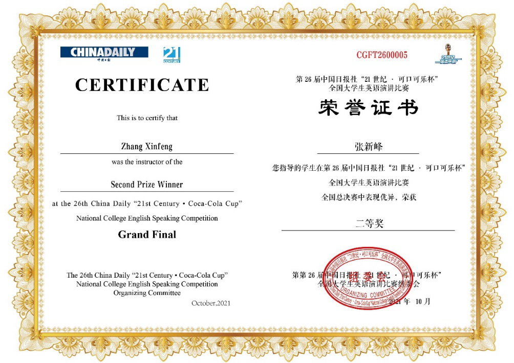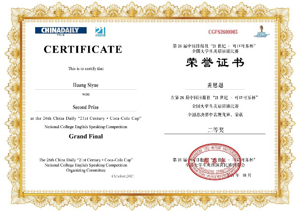 10月6日,《中国日报》社“21世纪杯”全国英语演讲比赛总决赛在成都落下帷幕,经过3天的激烈角逐,乐动网页版_乐动(中国)2019级英语专业黄思越同学表现卓越,脱颖而出,荣获得全国二等奖的佳绩。