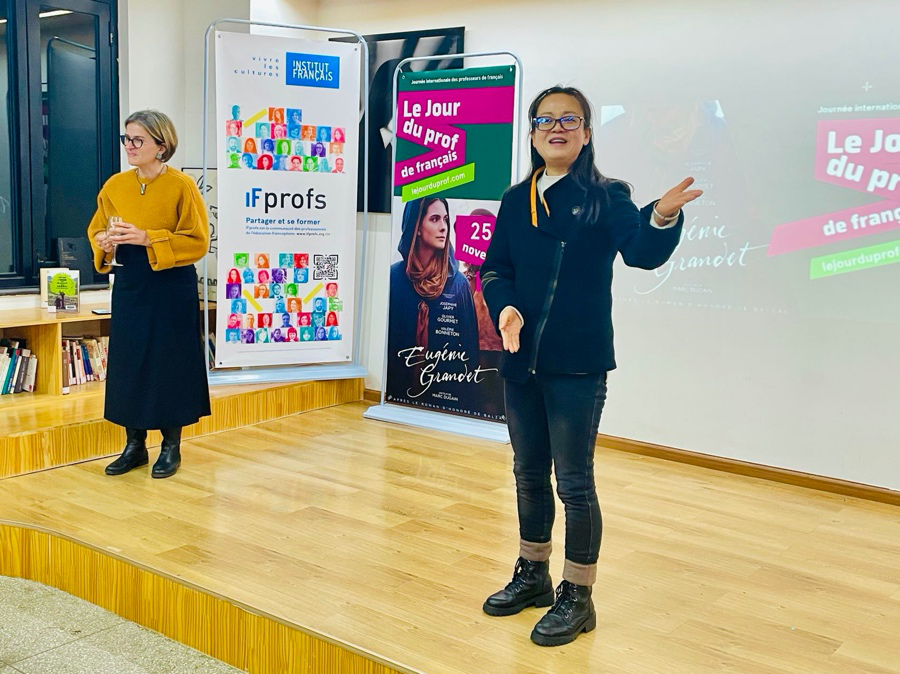 晚会由昆明法盟法方校长尹冬茗女士Dorothée Rihal和中方校长兼乐动网页版_乐动(中国)欧亚语言文学系系主任孙芳女士致欢迎词,祝各位法语教师们与来宾节日快乐。