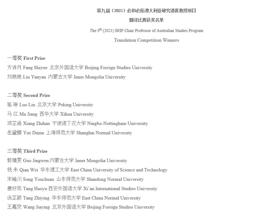 必和必拓澳大利亚研究讲席教授项目翻译比赛由北京外国语大学澳大利亚研究中心负责承办,并组织多所高校的翻译专家参加评审。该项赛事每年举办一次,竞赛内容是将澳大利亚文学作品或者其它方面的著述翻译为中文。最近几年来,每年都有全国三十余所高校的本科生和硕士研究生参赛,旨在促进中国高校学生对澳大利亚社会和文化的深入了解,同时考察参赛学生的翻译能力和技巧。今年是云南大学英语翻硕研究生第二次参加此项比赛,和来自包括北京外国语大学、厦门大学、西安外国语大学、华东理工大学、内蒙古大学、华东师范大学等全国知名高校的数百名优秀学生进行激烈角逐。本次赛事共设一等奖2名,二等奖4名,三等奖6名,优秀奖10名。尹绍艳凭借出色的翻译水平荣获得优秀奖。