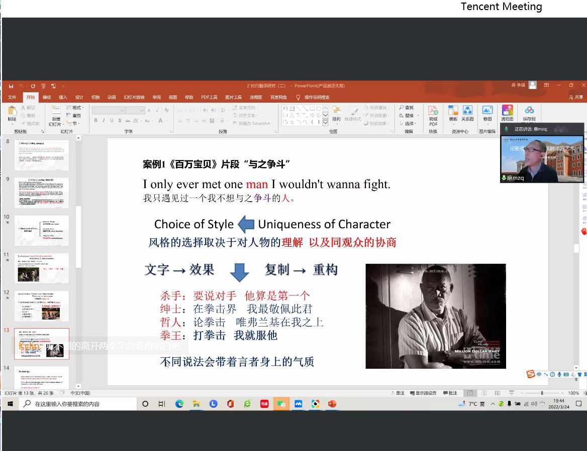 随后,麻教授提到在影视剧翻译过程中,译者追求的不仅是要把“意思说对”,更要努力“把话说好”,并重点分析在翻译时如何“把话说好”,从三个方面——性格化翻译、平面化翻译、立体化翻译——讲解了如何塑造人物形象,并通过一系列翻译实例展现了翻译构建话语的意义和修辞重构的艺术性。