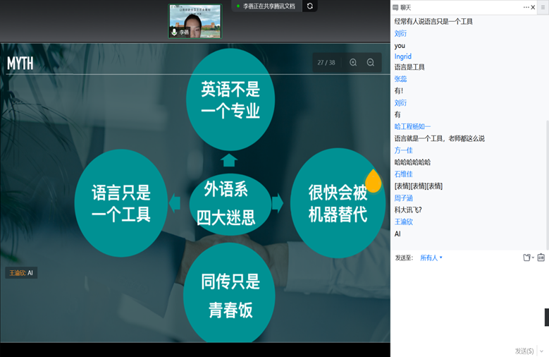 十八大以来国家高度重视国际传播能力建设和对外话语体系建设,我国翻译事业面临新起点,语言学习者面临新机遇。本次讲座从职业同传译员的实践经历出发,回应了大家最关心的问题,增强了同学们对自身专业的热情和自信。