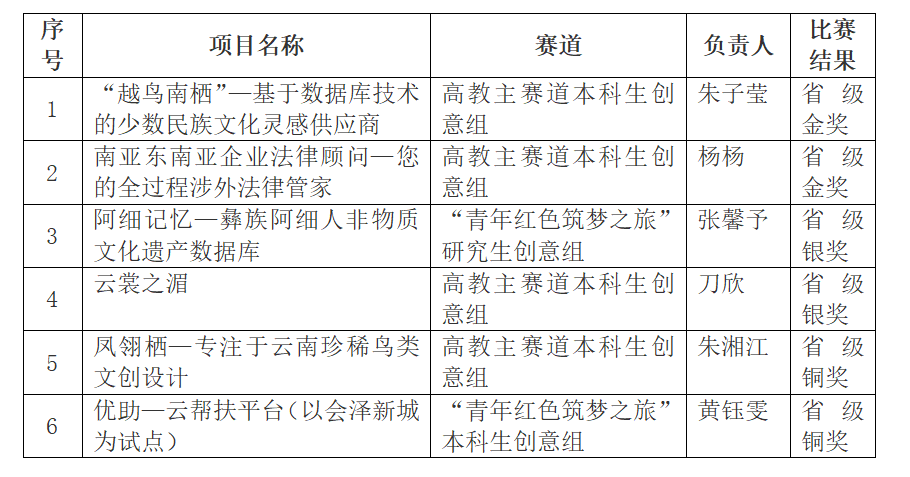进入7月的省内评审阶段,乐动网页版_乐动(中国)6个晋级省赛的项目均顺利通过省内初审。其中高教主赛道的《“越鸟南栖”—基于数据库技术的少数民族文化灵感供应商》、《南亚东南亚企业法律顾问—您的全过程涉外法律管家》项目和“青年红色筑梦之旅”赛道的《阿细记忆—彝族阿细人非物质文化遗产数据库》项目入围省级金奖争夺赛现场路演决赛。