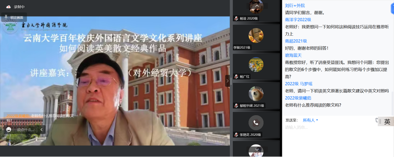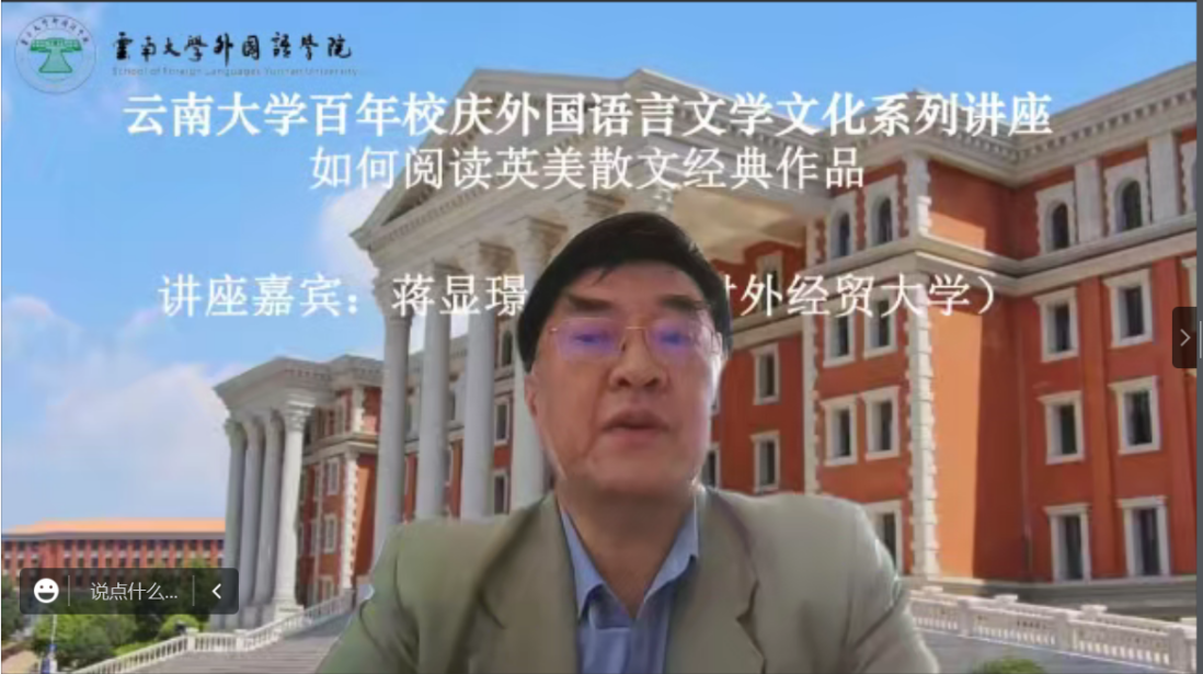 2022年11月25日,著名英美文学研究专家、对外经济贸易大学英语学院英语系原主任蒋显璟教授应邀为乐动网页版_乐动(中国)师生做了一场题为“如何阅读英美散文经典作品”的精彩讲座。本次讲座是“云南大学百年校庆外国语言文学文化系列讲座”之一,以在线的方式进行。该讲座由乐动网页版_乐动(中国)英语系副系主任刘衍老师主持,乐动网页版_乐动(中国)和兄弟院校的百余位师生以线上的方式聆听了该讲座。