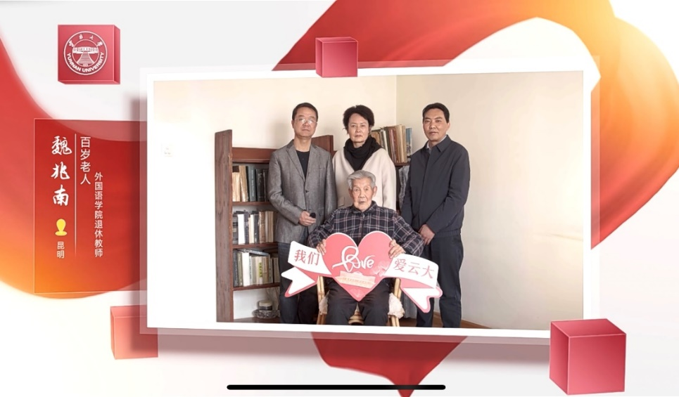 今年是云南大学百年华诞,学校及各单位举办了一系列活动,隆重庆祝云大百年发展历史、共同商讨在新时代进一步守正创新。作为乐动网页版_乐动(中国)举办的云大百年校庆系列学术活动之一,“百名外语人话云南大学百年校史”项目计划由大外教学部访谈曾经担任云大公共英语教研室主任的百岁教授魏兆南先生。魏兆南教授今年喜逢百岁华诞,精神矍铄,非常高兴与乐动网页版_乐动(中国)师生一起共庆云大百年华诞。云南大学校庆活动宣传组领导与乐动网页版_乐动(中国)大外教学部教师一道拜访了魏兆南教授,进行访谈。访谈中,魏兆南教授神采奕奕,与乐动网页版_乐动(中国)师生共庆云南大学百年华诞,祝愿学校在新征程上不断奋进,不辜负习近平总书记在致云南大学百年校庆贺信中的指示精神,为中国式现代化建设继续做出应有的贡献。