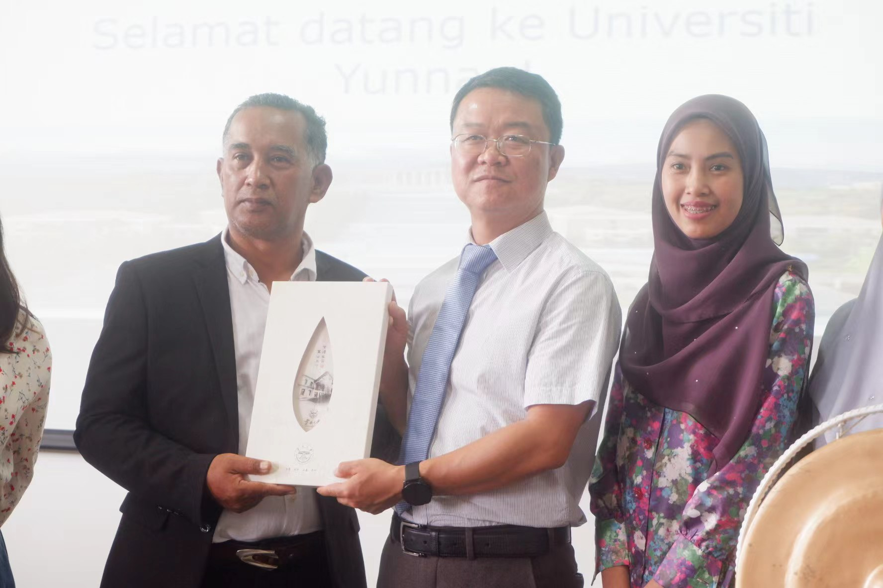 座谈会最后,吉兰丹大学代表团赠予马来语专业由阿斯瓦维先生亲手制作的马来西亚传统乐器一套。据悉,这是阿斯瓦威先生首次向友校赠送该礼品。外国语学院则赠予吉兰丹大学代表团云南传统非遗风筝一支、云南大学百年校庆文创产品一套以及外国语学院文创产品等。