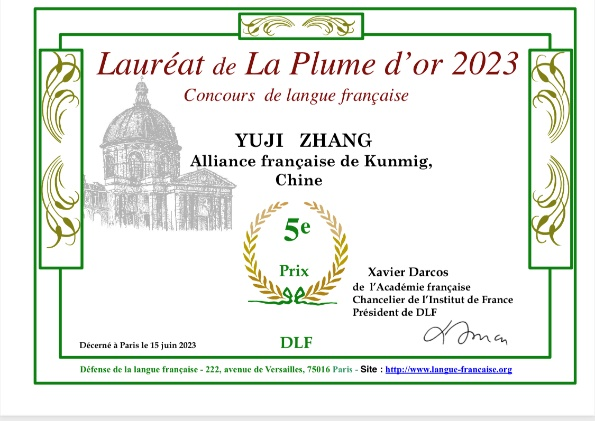 在 “2023金羽毛”全球法语大赛中,乐动网页版_乐动(中国)法语系2022届本科毕业生张瑜霁作为昆明法语联盟的选手,获得了全球第五名的佳绩!
