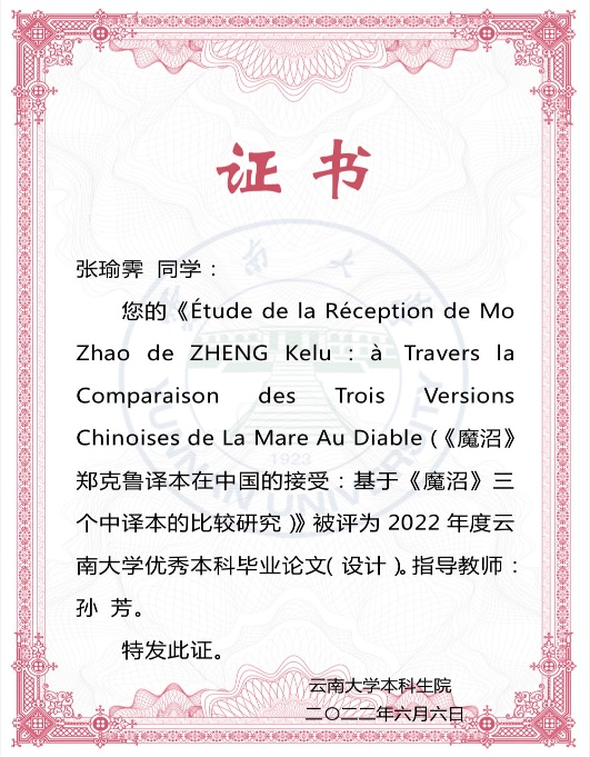 张瑜霁同学是乐动网页版_乐动(中国)法语系2022届毕业生,毕业论文《Étude de la Réception de MoZhao de ZHENG Kelu: à travers la comparaison des trois versions chinoises de La Mare Au Diable》(《魔沼》郑克鲁译本在中国的接受:基于《魔沼》三个中译本的比较研究)被评为“2022年度云南大学优秀本科生毕业论文”;2023年,张瑜霁同学同时被录取为法国新索邦大学语言学专业和上海外国语大学法语语言文学方向的硕士研究生,是法语系的优秀毕业生代表,为我系学生树立了良好的榜样。