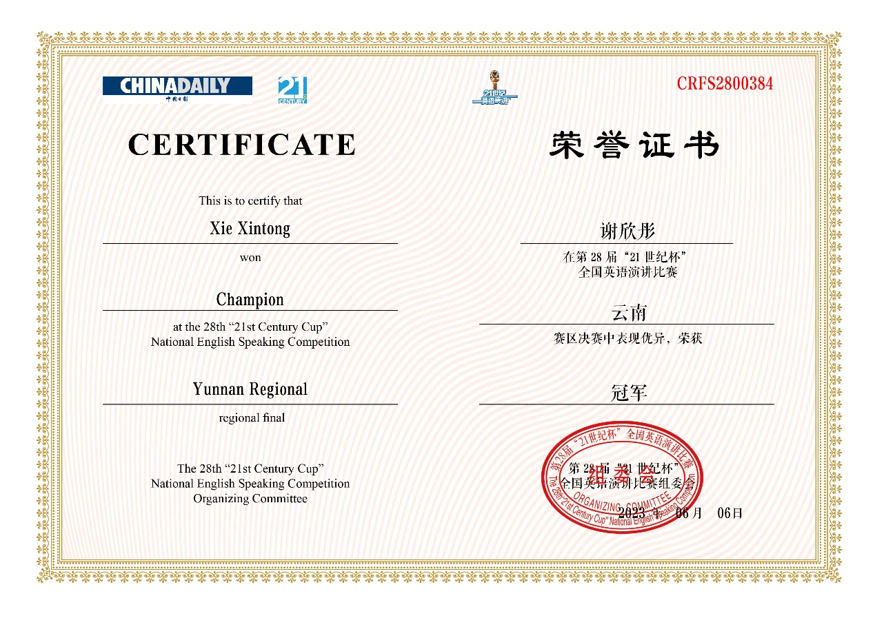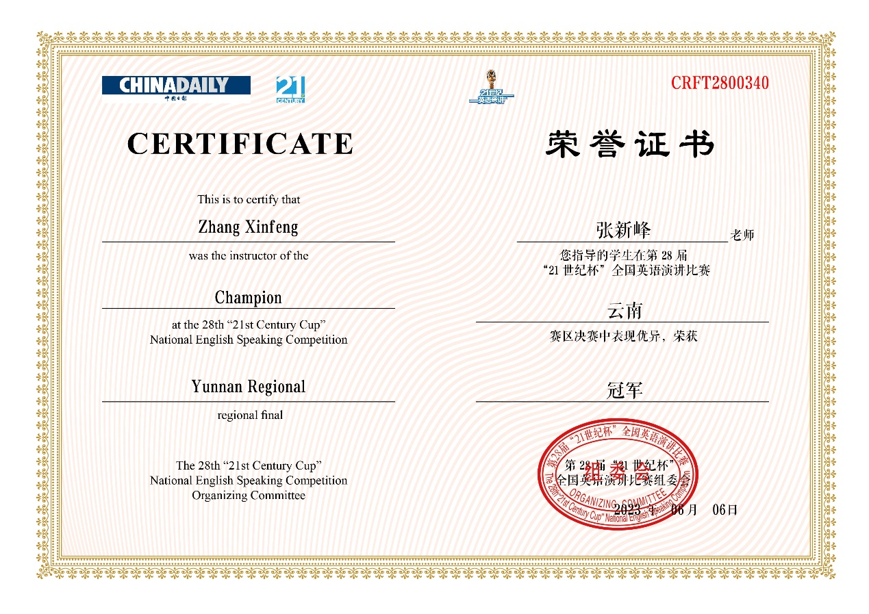 6月18日,第28届“21世纪杯”全国英语演讲比赛云南地区决赛在昆明文理学院落下帷幕。乐动网页版_乐动(中国)英语系张新峰老师指导的2021级本科生谢欣彤同学获得冠军,将代表云南省参加8月举行的全国总决赛。