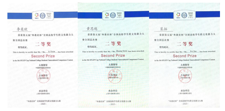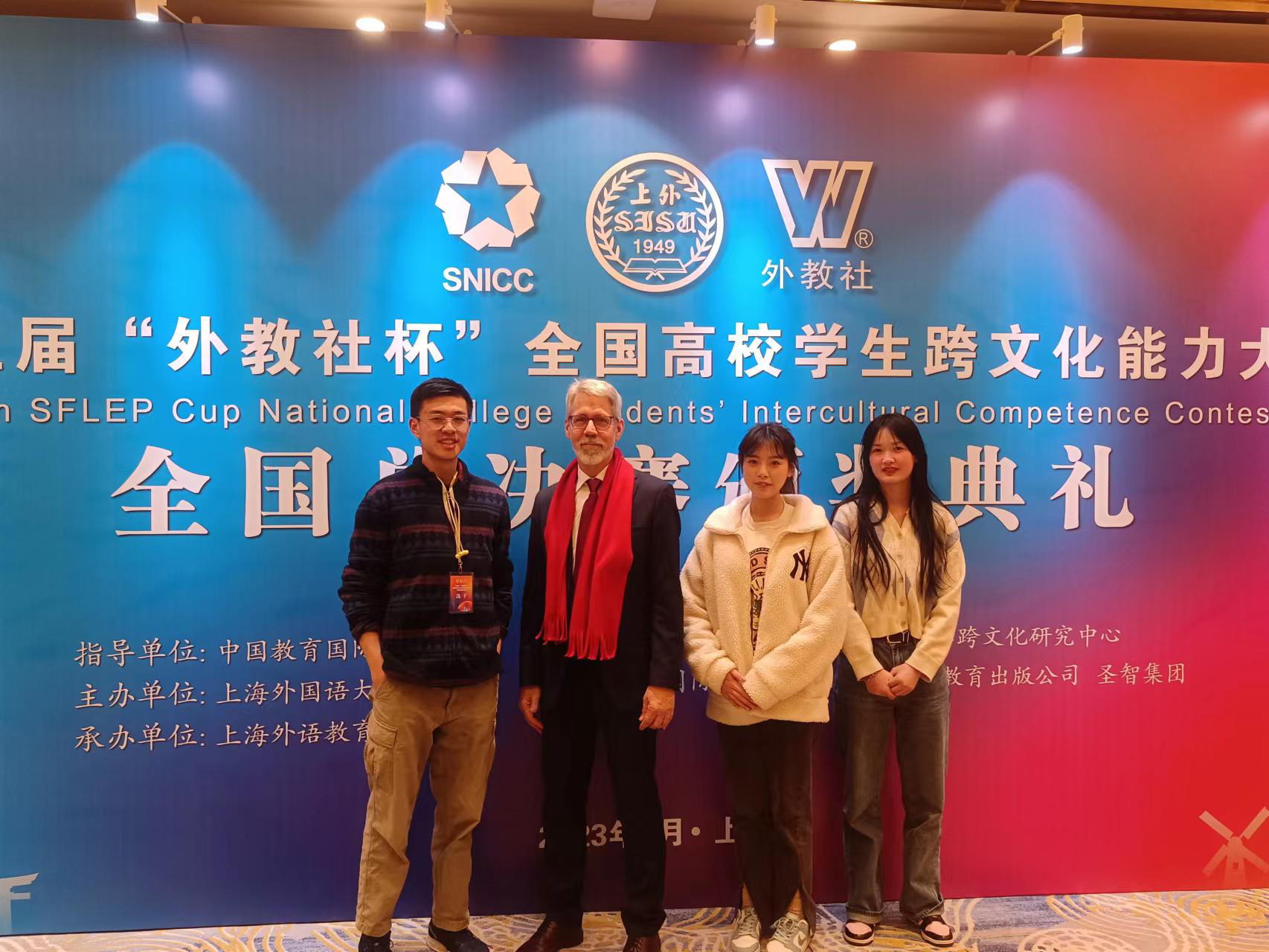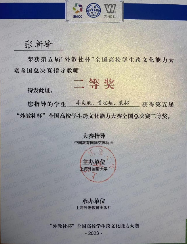 2月24日至26日,由上海外国语大学主办的第五届“外教社杯”全国高校学生跨文化能力大赛全国总决赛在上海举行。40支中国学生队伍和4支国际学生队伍历经校赛和省赛选拔脱颖而出,在全国决赛的舞台上同台竞技、大放异彩。乐动网页版_乐动(中国)本科生黄思越(2019级英语专业)、李奕欣(2020级英语专业)、裴拓(2021级法语专业)三位同学在张新峰老师的指导下取得了全国决赛二等奖的好成绩。