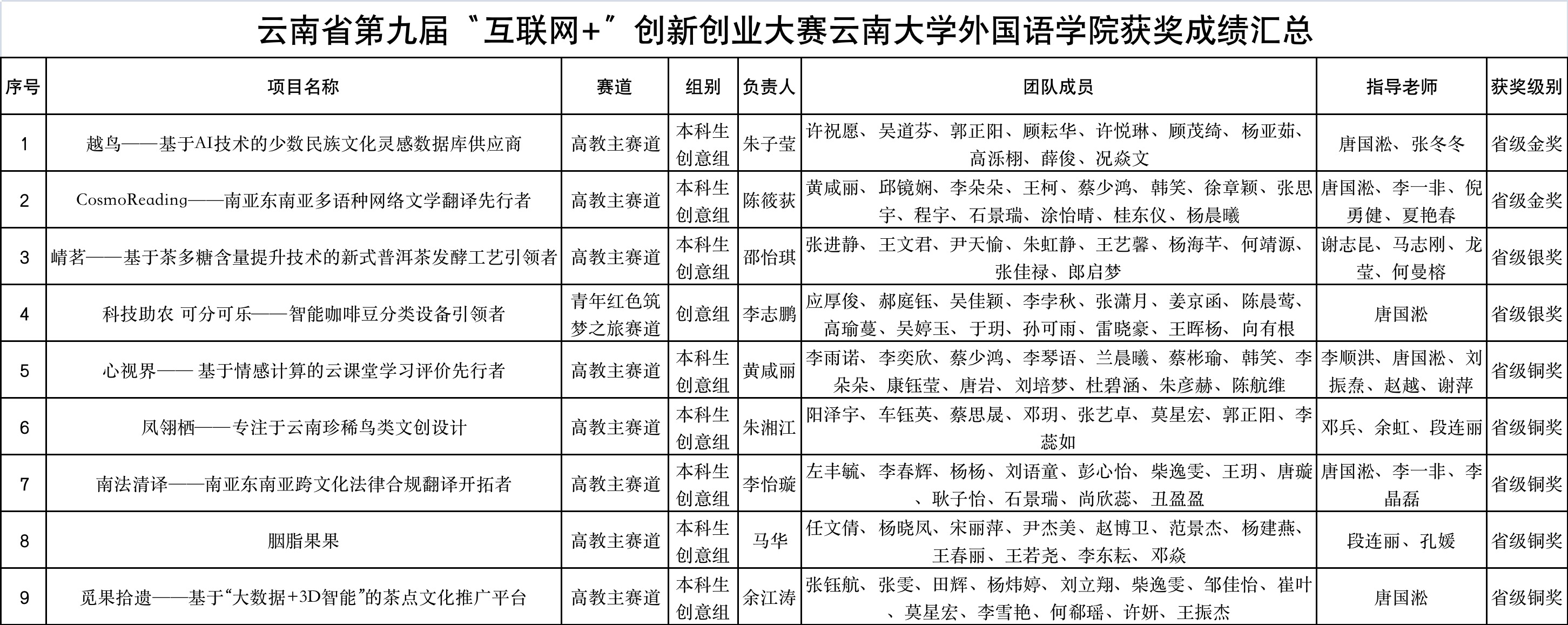 2023年7月25-26日,第九届云南省“互联网+”大学生创新创业大赛决赛在昆明举行,本届大赛由昆明学院承办。外国语学院通过院赛、校赛、省赛网评的层层选拔,最终有9个项目入围省赛决赛,并最终获得金奖2项(全校排名第四)、银奖2项、铜奖5项的历史最好成绩。《越鸟——基于AI技术的少数民族文化灵感数据库供应商》和《CosmoReading——南亚东南亚多语种网络文学翻译先行者》获得了省级金奖;《崝茗——基于茶多糖含量提升技术的新式普洱茶发酵工艺引领者》和《科技助农 可分可乐——智能咖啡豆分类设备引领者》获得了省级银奖;《心视界—— 基于情感计算的云课堂学习评价先行者》等4个项目获得了省级铜奖。