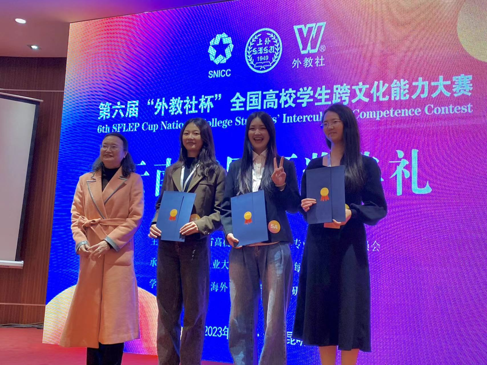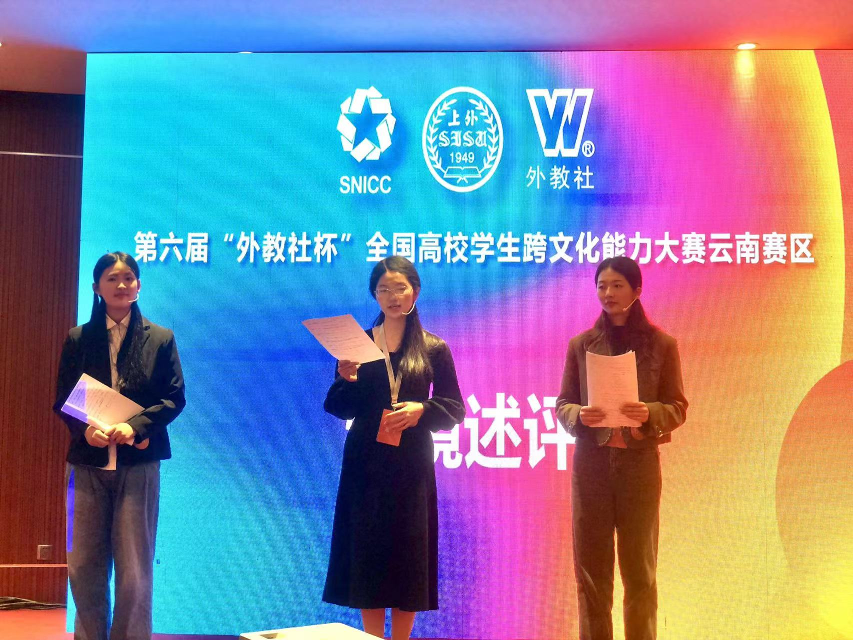 2023年11月18日,在第六届“外教社杯”全国高校学生跨文化能力大赛云南省省赛比赛中,乐动网页版_乐动(中国)本科生英语组团队岳含溢(2021级英语专业)、马文菁(2021级法语专业)、裴拓(2021级法语专业),在张新峰老师和杨晓燕老师的指导下,获得云南省省赛特等奖(第一名)的好成绩,将代表云南省进军国赛。