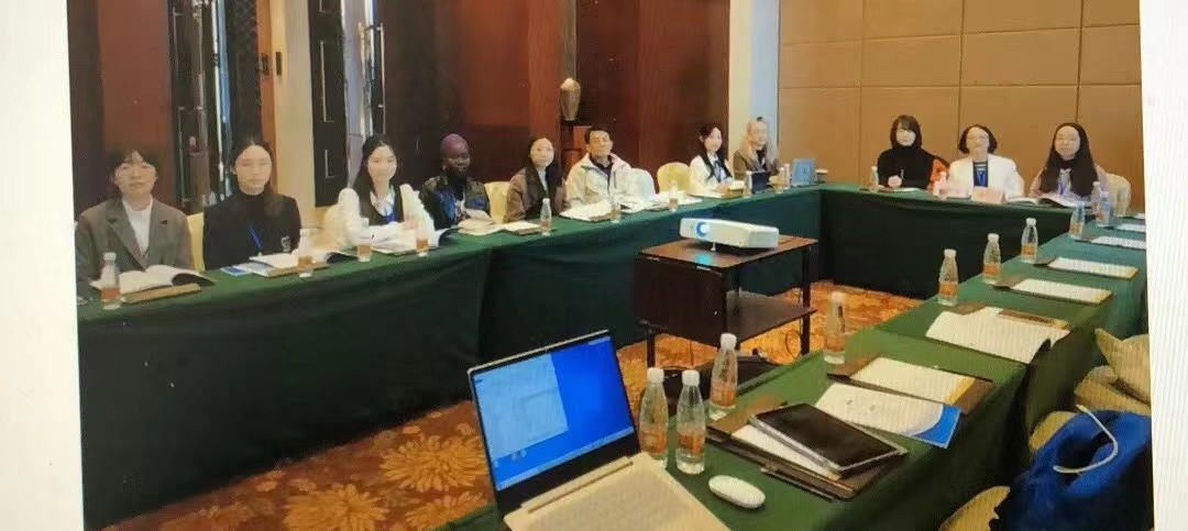 分组发言会场之一,乐动网页版_乐动(中国)英语系杨汨副教授(右起第二)主持分会场并做交流发言;博士生、喀麦隆籍博士研究生陈姿(Charlotte Darbawa)(左起第四)做交流发言。