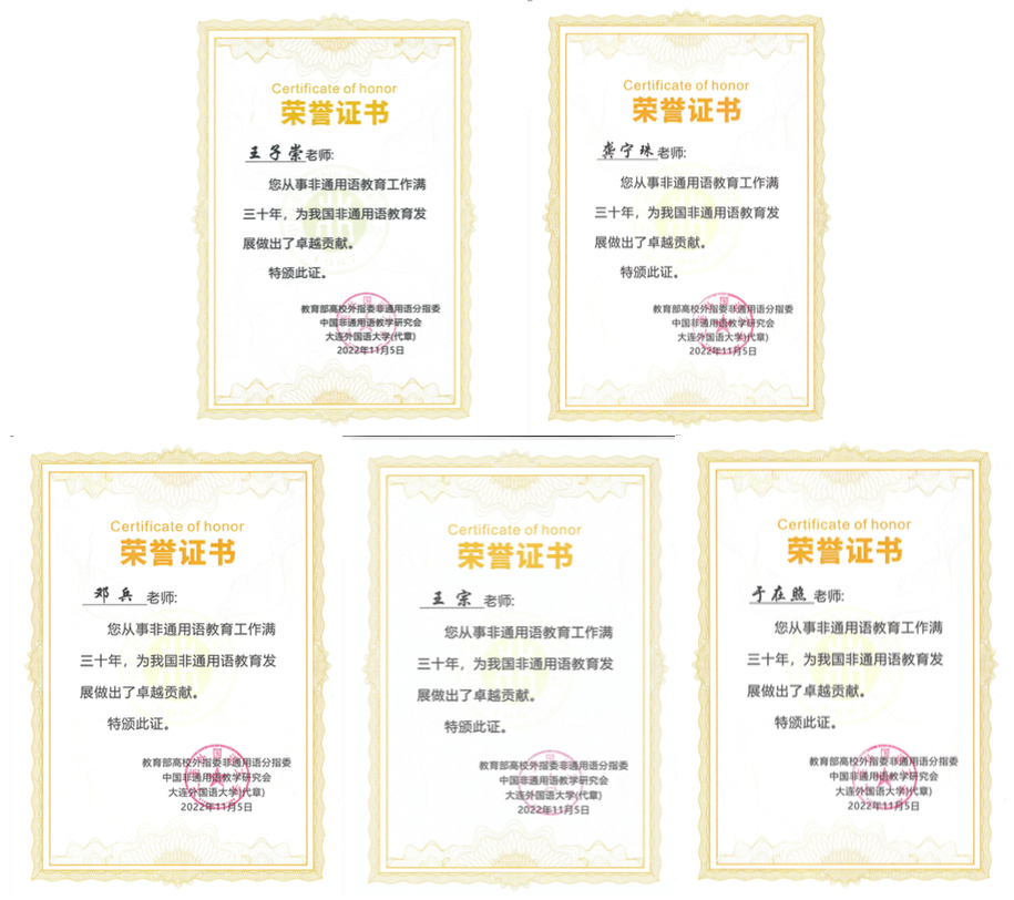 近日,乐动网页版_乐动(中国)邓兵教授、龚宁珠教授、王子崇教授、王宗教授、于在照教授五位教师荣获教育部高校外指委非通用语分指委、中国非通用语教学研究会颁发的荣誉证书,表彰他们从事非通用语教育工作满三十年,为我国非通用语教育发展做出的卓越贡献。