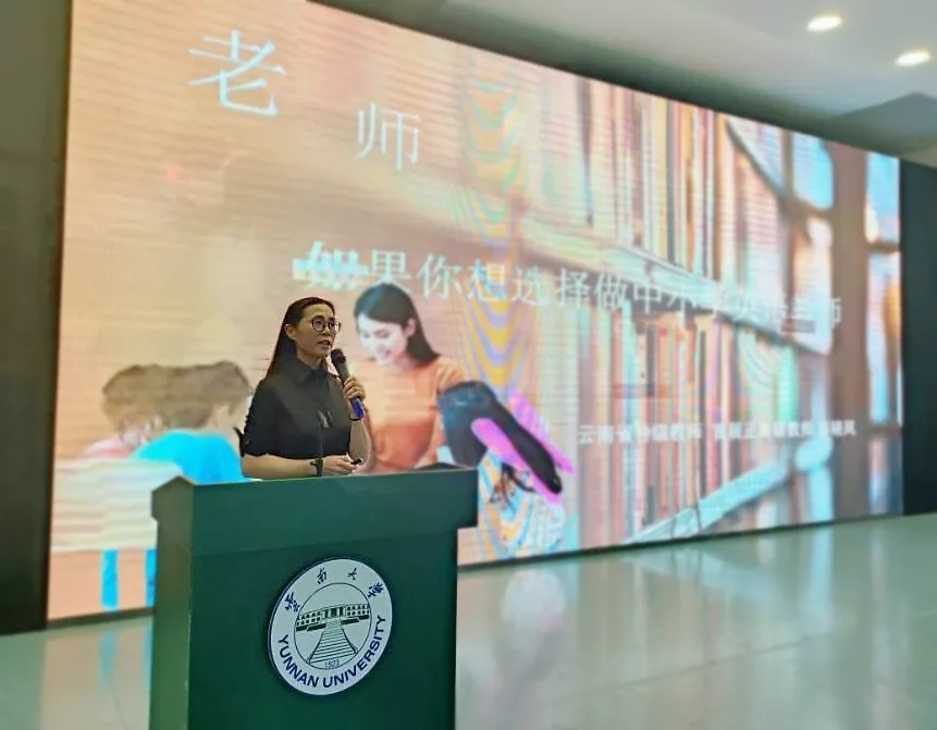 “彭晓凤名师工作室”主持人彭晓凤老师上台发言。彭老师首先表达了她对云南大学、对外国语学院师生的喜爱之情。接着,彭老师进一步明确自身责任,她表示,作为乐动网页版_乐动(中国)·云南省中小学英语教育名师工作室的主持人,她倍感荣幸;但这同时也是一份沉甸甸的责任,是一种挑战,更是一种激励和鞭策。作为名师工作室的主持人,她会严格按照人才培养需要,与同学们相互学习,共同进步,进一步提高英语基础教育的质量和水平。最后,彭老师再次表达了对云南大学、对外国语学院的领导、老师和同学们的祝福与感谢。