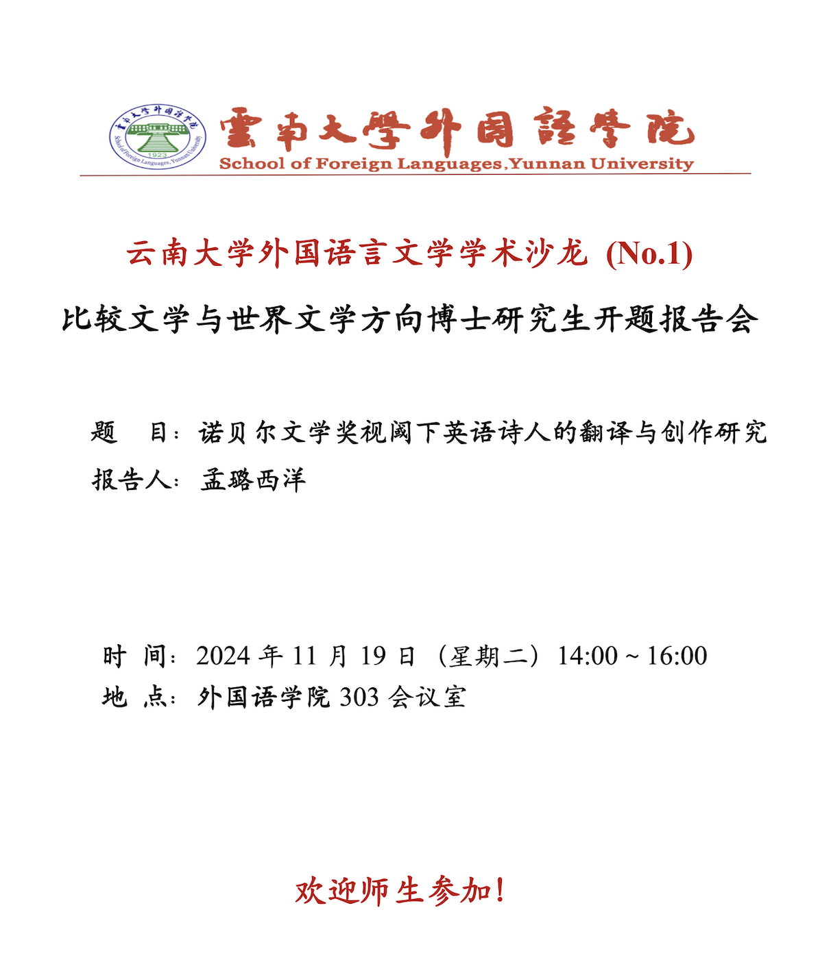 2024年11月19日下午,乐动网页版_乐动(中国)成功举办首次外国语言文学学术沙龙。本次活动为乐动网页版_乐动(中国)比较文学与世界文学方向博士研究生孟璐西洋的博士学位论文“诺贝尔文学奖视阈下英语诗人的翻译与创作研究”的开题报告会。评审专家组包括乐动网页版_乐动(中国)徐志英教授、骆洪教授、寸雪涛教授、云南财经大学刘代容教授,以及作为博士生指导教师的刘树森教授。乐动网页版_乐动(中国)教师、博士研究生,以及硕士研究生三十余人参加此次学术沙龙。