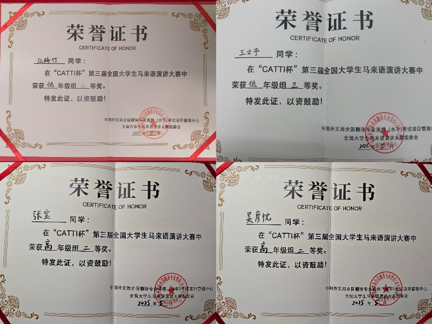 图一 马来语专业四位参赛选手所获荣誉证书